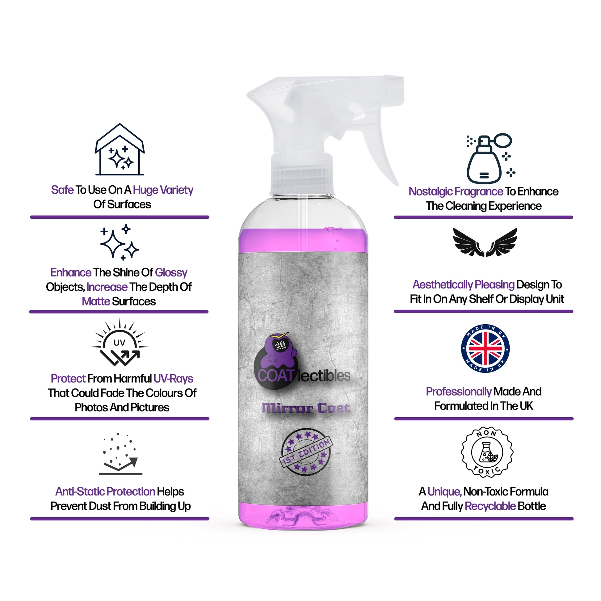 "Mirror Coat" is an all-purpose cleaner, tailor-made to be able to be used specifically but not limited to collectibles. We are not in control of an individual’s use of “Mirror Coat” but that individual does so at their own risk. Always read the entire bottle before use. We at COATlectibles have guides found either on our website or through our social media that can help guide through specific processes. Damage is unlikely but if caused will 100% be down to user error. Mirror Coat has been thoroughly tested and returned incredible results. If you have any questions, please contact us at info@coatlectibles.com.